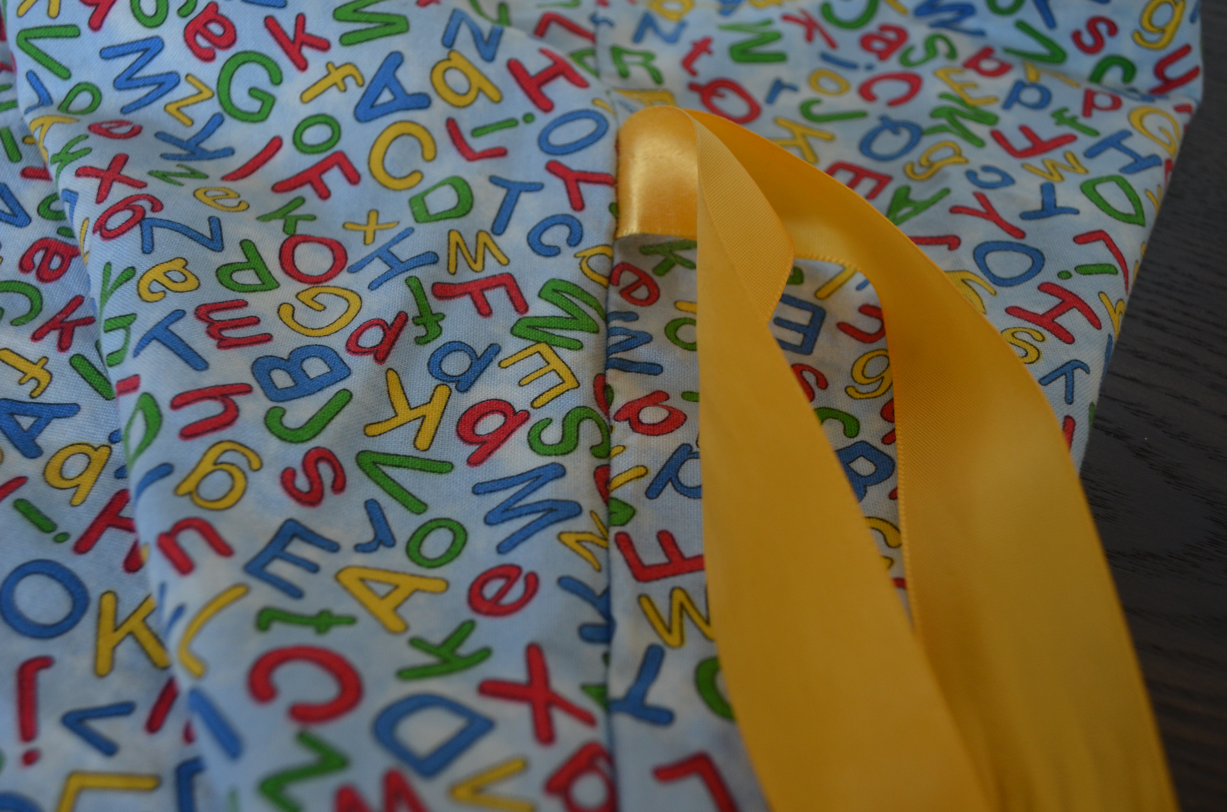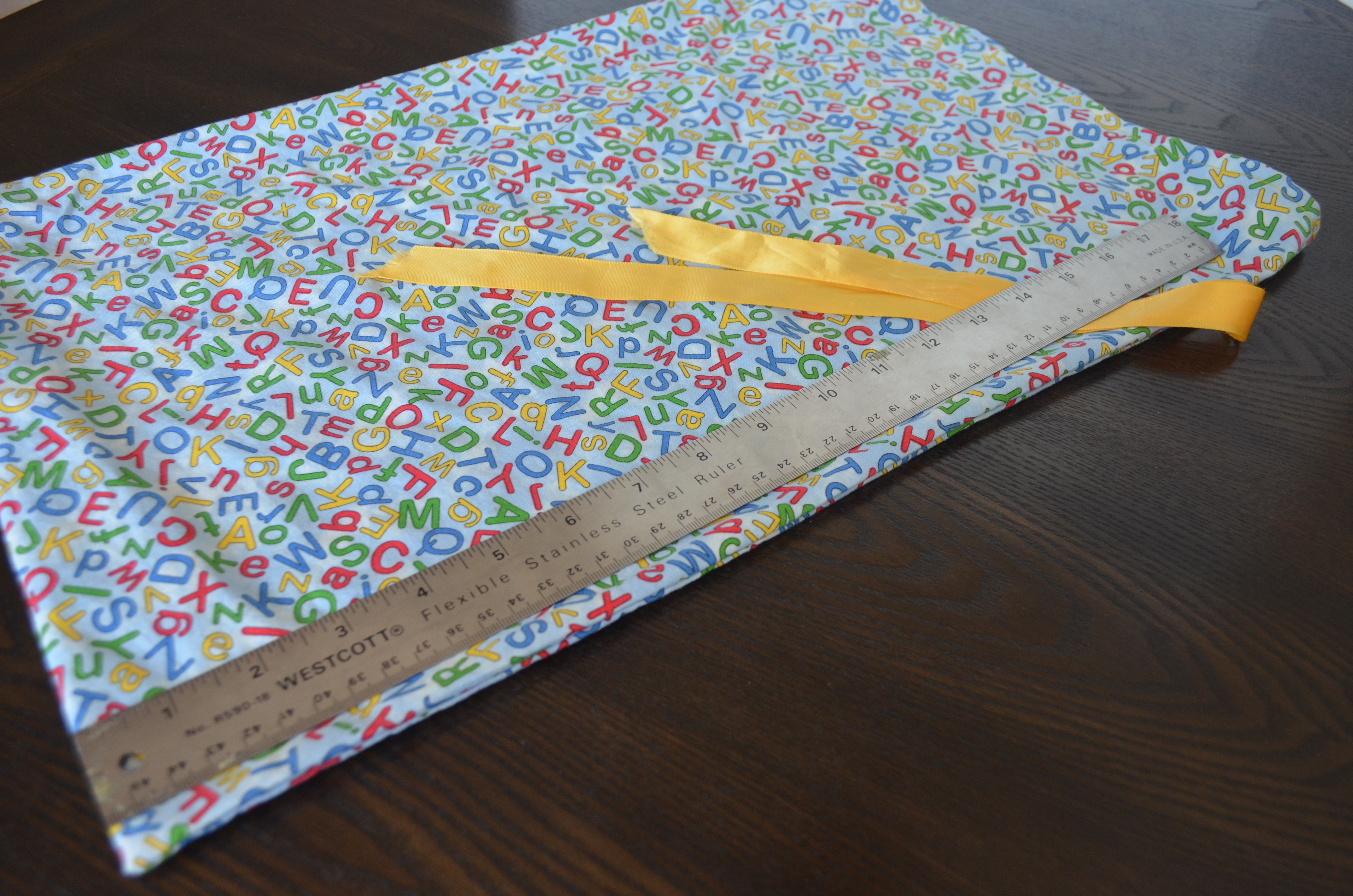 I stitched ribbon into the side seam so the letter learning bag can be tied closed.