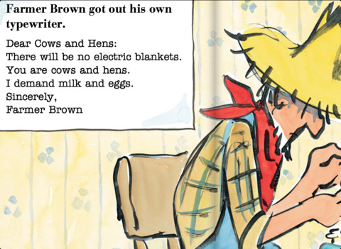 Poor Farmer Brown, his frustration with the upstart farm animals is clear. His farm simply must have milk and eggs.