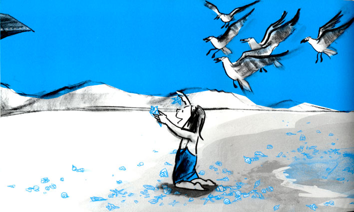 When a young girl arrives at a beach, she is filled with enthusiasm and dashes forward, stopping just short of the beautiful, frothy blue water. She hesitates on the sand, pausing, leaning as she is drawn toward the ocean. Suddenly, the character of the water changes. Worried, she tentatively shifts backward, her steps mirrored by a group of friendly gulls. As the waves reverse and retreat, our young heroine stands on her tip toes and challenges the salty water. Before long, she leaps into the dancing waves, joyfully kicking and splashing until an enormous wave erupts. The powerful crest leaves her sodden but excited when it deposits a bounty of shells on the sandy beach.